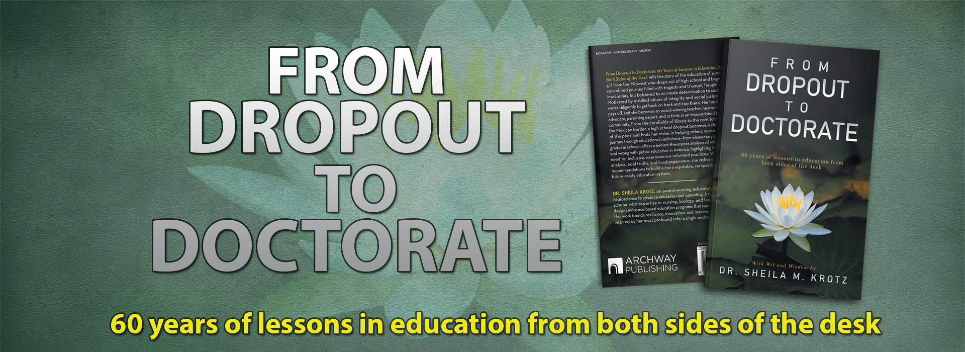 In From Dropout to Doctorate, Dr. Sheila M. Krotz delivers a raw, deeply personal, and powerfully analytical memoir that traces her six-decade journey through the American educational system—first as a struggling student, then as a tenacious learner, and finally as a trailblazing educator, administrator, parent coach, and advocate. Her story begins in the heartland of Illinois and winds its way to an underserved school at the U.S.-Mexico border, where she becomes a champion for students living in poverty.